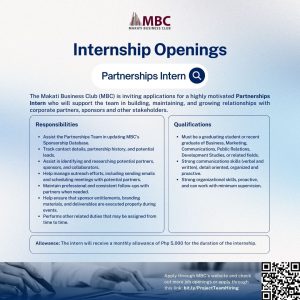Partnerships Intern The Makati Business Club (MBC) is inviting applications for a highly motivated Partnerships Intern in building, maintaining, and growing relationships with corporate partners,