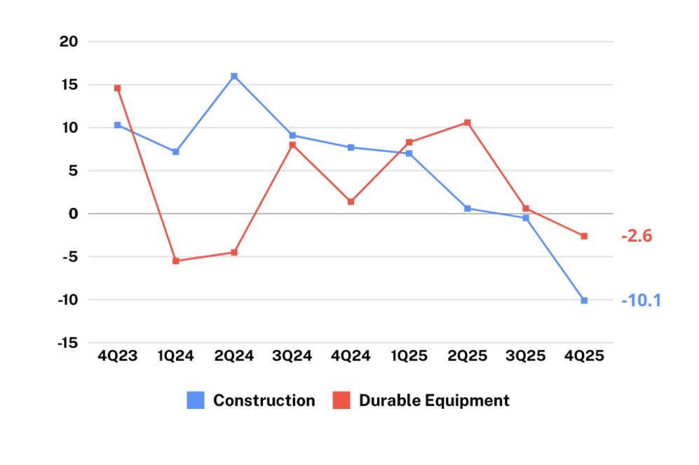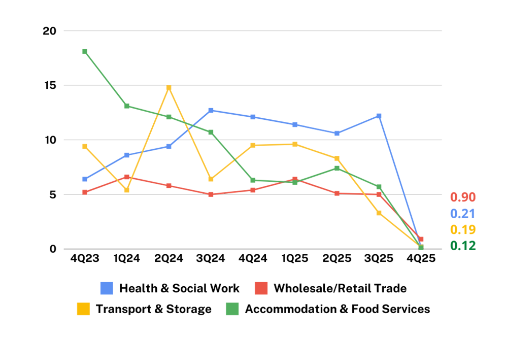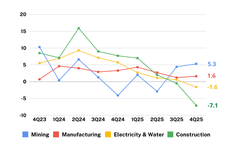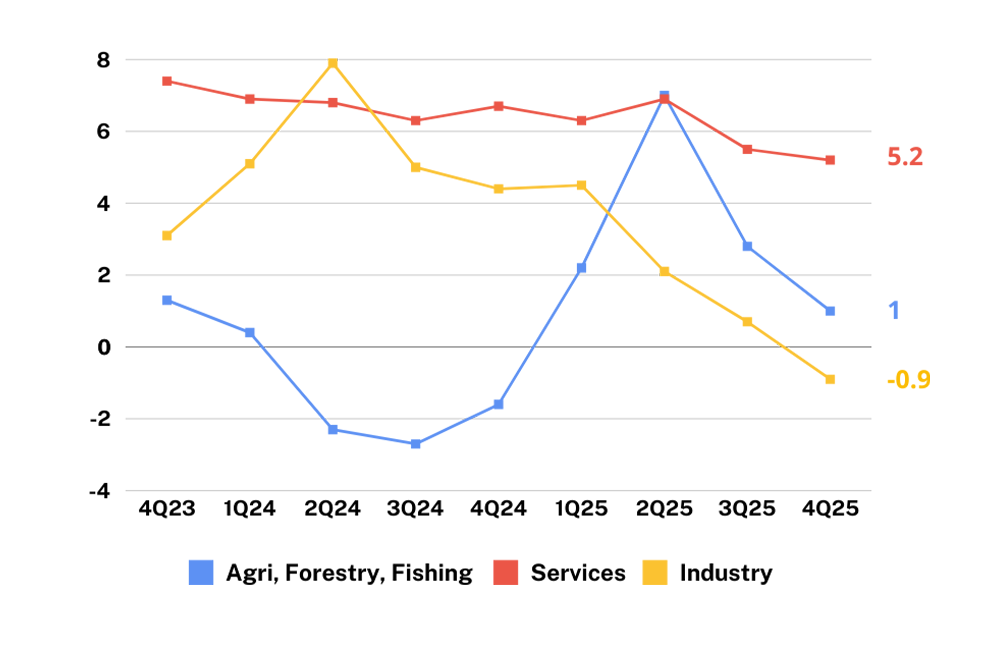 Among industries, the fastest-growing sectors in Q4 were Human Health and Social Work Activities (+11.5%), Education (+8.4%), Public Administration and Defense; Compulsory Social Security (+8.0%), and Transportation and Storage (+6.8%). The largest contributors to GDP growth during the quarter were Wholesale and Retail Trade (0.9 percentage point), Financial and Insurance Activities (0.5 percentage point), and Public Administration and Defense (0.4 percentage point).