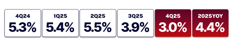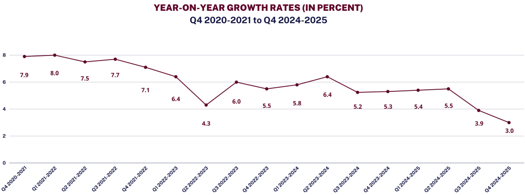 29 January 2026 — The Philippine economy grew by 3.0% in the fourth quarter of 2025, significantly lower than the 5.3% growth recorded in the same quarter last year, according to the Philippine Statistics Authority (PSA). This wraps up the full year growth for 2025 at 4.4% from 5.7% in 2024. This is significantly below the government’s growth target of 5.5 to 6.5 percent for 2025. Both numbers are also below the median forecast of economists at 4.2% for Q4 2025 and 4.8% for full year growth. Notably, this performance marks the slowest full-year post- pandemic expansion for the Philippine economy. Outside of the pandemic, Q4 2025 is the slowest growth since Q3 2011 (both at 3%), when the Aquino administration suspended several infrastructure projects over corruption concerns linked to the previous government, leading to a 31.8% decline in government construction spending.