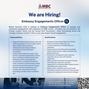 Embassy Engagements Officer Makati Business Club is seeking an Embassy Engagements Officer to manage and coordinate engagements with embassies for MBC events—including, but not limited