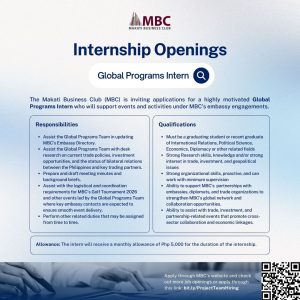 Global Programs Intern The Makati Business Club (MBC) is inviting applications for a highly motivated Global Programs Intern who will support events and activities under