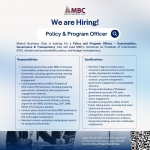 Policy & Program OfficerSustainability, Governance & Transparency Makati Business Club is looking for a Programs and Policy Officer – Sustainability, Governance & Transparency who will lead