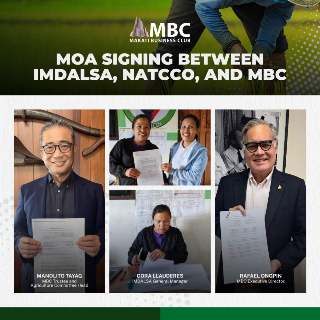 The Makati Business Club is proud to announce the signing of a Memorandum of Agreement between IMDALSA Agrarian Reform Cooperative, National Confederation of Cooperatives (NATCCO), and MBC. This marks a significant milestone in our commitment to strengthening cooperatives through training.