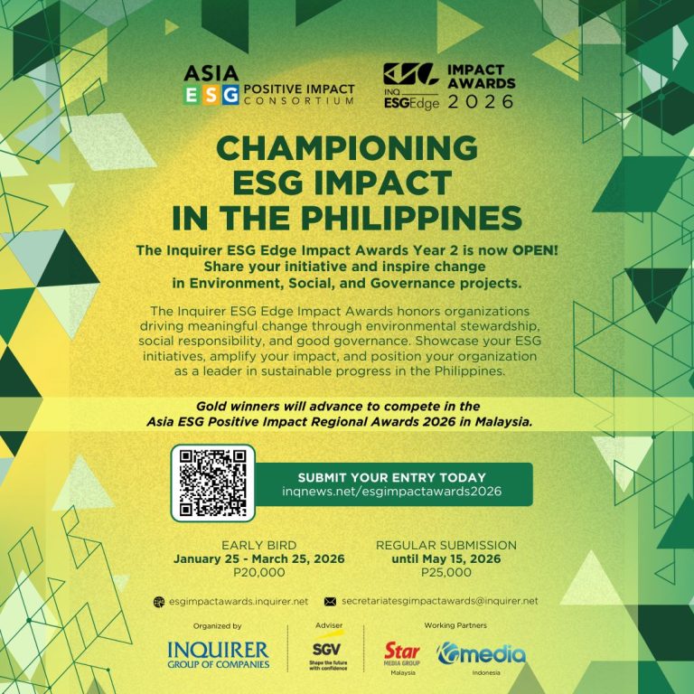 The Inquirer ESG Edge Impact Awards 2026 is officially calling for entries from organizations across the Philippines. Now in its second year, the Inquirer ESG Edge Impact Awards invites organizations across the Philippines to step forward and share the positive change they are creating—for people, the planet, and good governance. Gold winners will earn the exclusive opportunity to represent the Philippines and compete in the Asia ESG Positive Impact Regional Awards 2026 in Malaysia. Submit your entry today and take advantage of the early bird pricing.